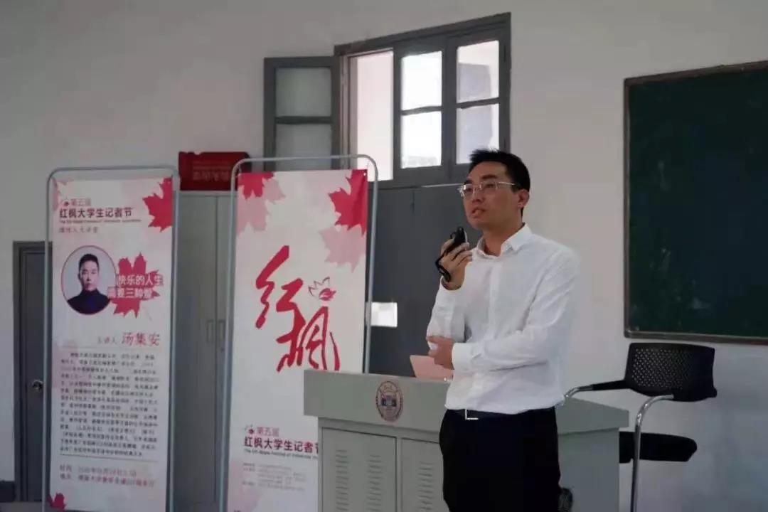 10月28日下午,汤集安出现在湖南大学。作为第五届红枫大学生记者节媒体人大讲堂第二期的主讲嘉宾,汤集安进行了题为《快乐的人生需要三种“爱”》的演讲。