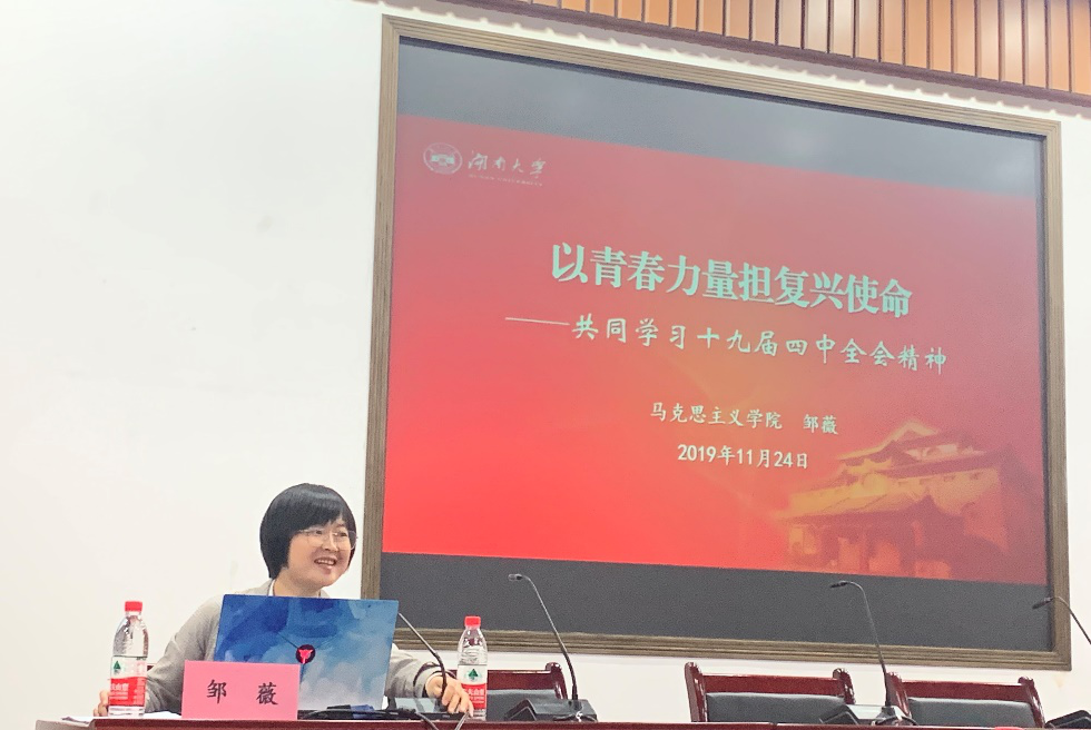 2019年11月24日晚七点,湖南大学新闻传播与影视艺术学院第66期学生入党积极分子培训班在北楼217举行了第六次培训。学院有幸邀请到了湖南大学马克思主义学院的邹薇老师,为我们带来“以青春力量担复兴使命——共同学习十九届四中全会精神”主题课程讲授。