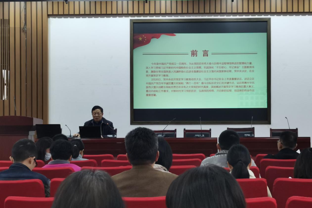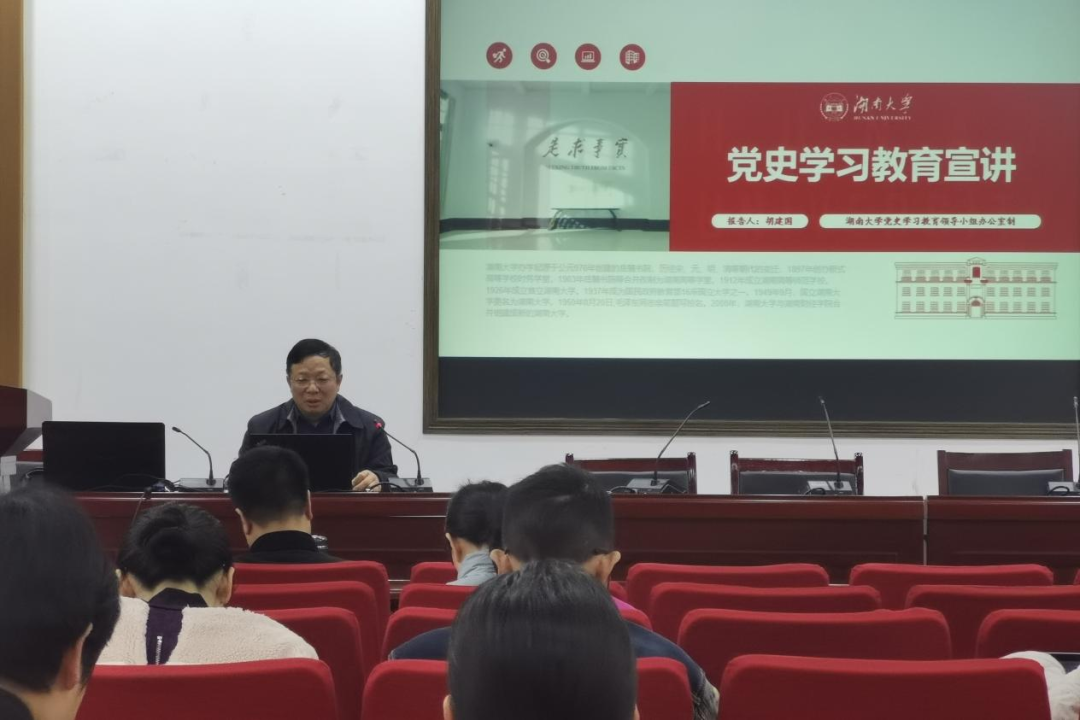 召开学院党史学习教育宣讲大会在学院217报告厅举行。大会由学院党委副处级组织员孙建中主持,党委书记、湖南大学党史学习宣讲团成员胡建国作宣讲,全体在校教职工党员参加了此次学习。