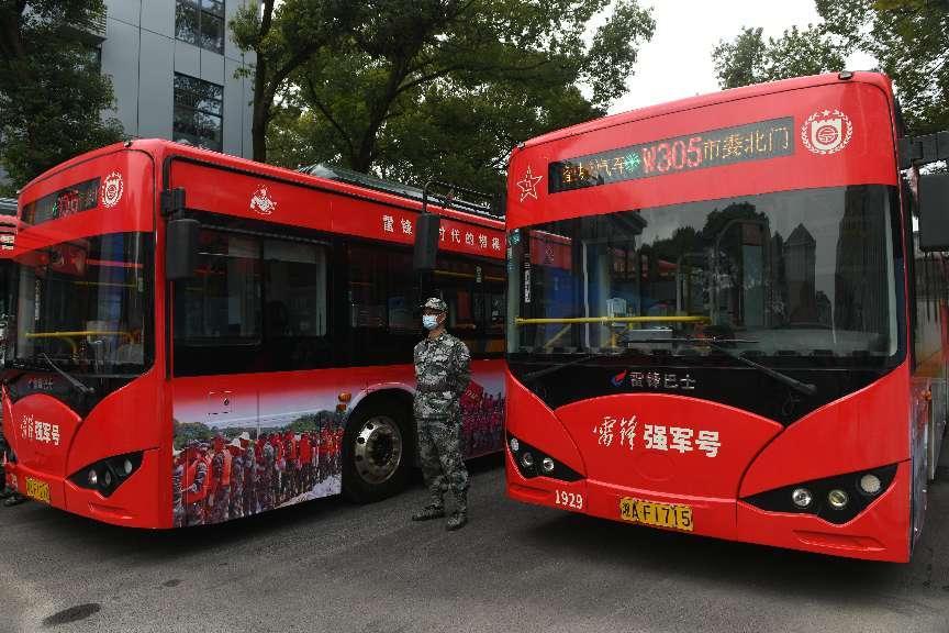 揭牌仪式后,W305“雷锋·强军号”公交专线首发,与会领导与师生代表登车观摩。