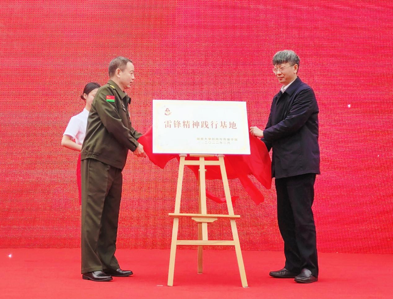 湖南省军区副政委郝先维少将和湖南大学副校长蒋健晖共同为av视频 “雷锋精神践行基地”揭牌。