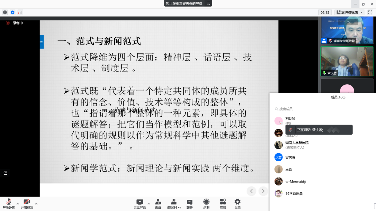 11月9日下午,岳麓传媒论坛第98期于“云端”腾讯会议室举行。此次学术讲座以“中国特色社会主义新闻学的新闻范式:宣传、专业、交往”为主题,由中国社会科学院新闻与传播研究所研究员、博士生导师曾庆香担任主讲嘉宾,av视频