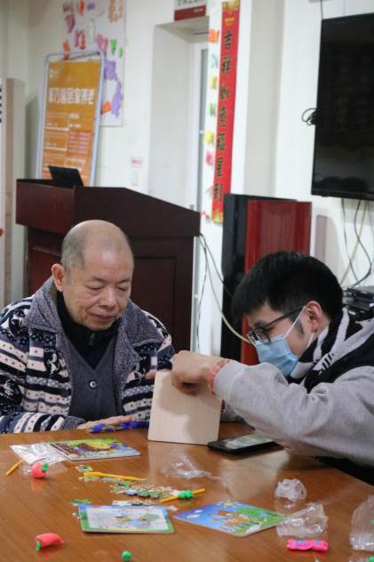 除了软陶泥的制作,志愿者们还陪老人们下象棋。伴随着手起手落,象棋在空中跳跃,再落在棋盘上,传来清脆的声响,和着笑声和叫好声,志愿者和老人度过了上午美好的时光。