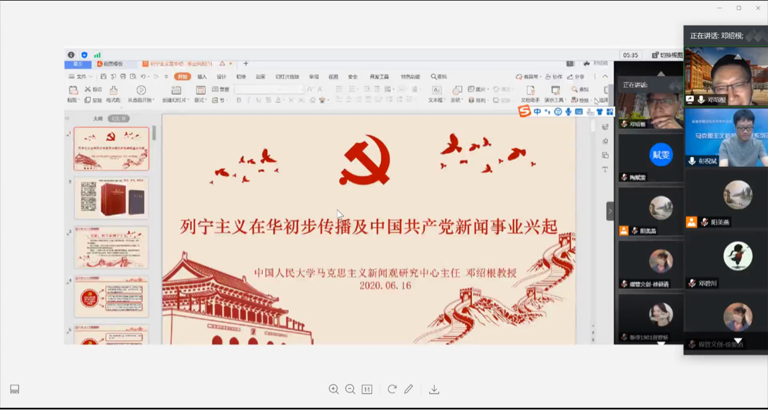 6月16日上午10:00,av视频 联合湖南大学马克思主义新闻观研究中心,于“云端”腾讯会议室举办了一场别开生面的学术讲座。此次讲座以“列宁主义在华初步传播与中国共产党新闻事业的兴起”为题,由中国人民大学新闻学院教授、中国新闻史学会联席秘书长、中国人民大学马克思主义新闻观研究中心主任邓绍根教授担任主讲,av视频 院长彭祝斌教授主持,新影院和学界300余名师生在线参与。