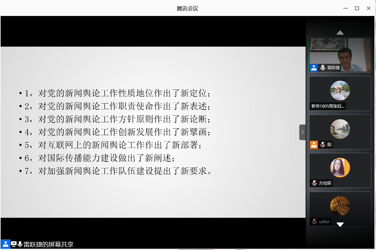 6月12日上午,湖南大学新闻传播与影视艺术学院联合湖南大学马克思主义新闻观研究中心于“云端”腾讯会议室举办了一场特殊形式的学术讲座。作为岳麓传媒论坛马克思主义新闻观主题系列讲座的开篇之作,此次学术讲座以“马克思主义新闻观中国化的当代探索”为主题,由新影院特聘教授、岳麓学者雷跃捷教授担任主讲嘉宾,新影院副院长阳美燕教授担任主持人,学院师生200余人参与。