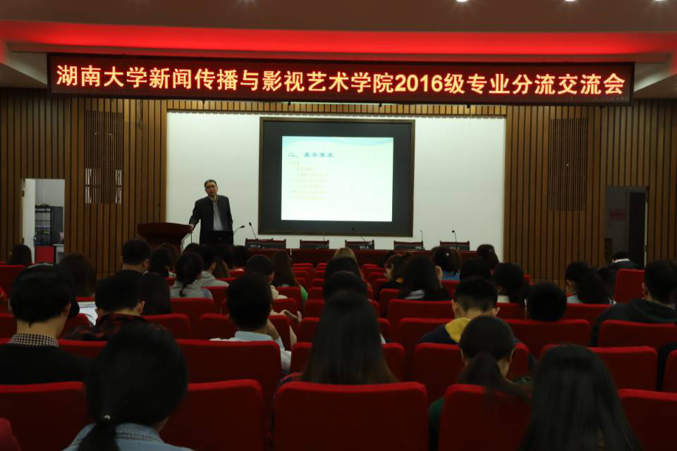 3月27日下午,湖南大学新闻传播与影视艺术学院在教学北楼217学术报告厅召开新闻传播学16级专业分流交流会,邀请了新影院新闻系主任徐琼、广告系主任莫梅锋、媒介经营管理系主任刘社瑞、网络与新媒体系老师戴松为即将选择分流专业的同学们进行专业介绍并提供指导。