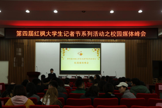 11月25日上午九点,第四届红枫大学生记者节系列活动之校园媒体峰会在湖南大学教学北楼召开。湖南日报报社高级编辑、中国新闻奖评奖专家刘爱民,人民网湖南频道负责人林洛頫,湖南大学新闻传播与影视艺术学院07级毕业生、湖南电视台《天天向上》导演组组长胡林峰,湖南大学新闻传播与影视艺术学院广播电视系主任戴松到场指导。参与此次峰会的有浙江大学、武汉大学、南京大学、暨南大学、华东政法大学、湖南大学等全国各高校校园媒体,他们就本次峰会议题“全媒体背景下校园媒体应如何行稳致远”,结合自身成长经历与实践体验进行交流讨论,从而探寻校园媒体发展的新方向。