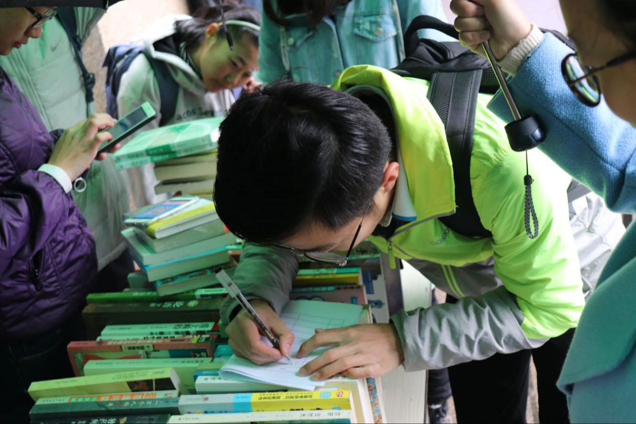 新传1702姚培璇:今天恰好碰上了狂风大作,雨丝飘飞,但是志愿者志愿活动热情不减,同学们买书也很积极,虽然天冷,但我觉得很温暖。