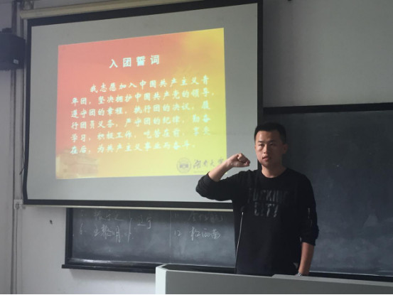 “我志愿加入中国共产主义青年团,坚决拥护中国共产党的领导,遵守团的章程,执行团的决议,履行团员义务,严守团的纪律,勤奋学习,积极工作,吃苦在前,享受在后,为共产主义事业而奋斗!”值此五四青年节,入团誓词久久地响彻在湖南大学教学北楼,令人荡气回肠。