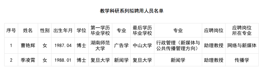 为做好人才引进工作,学院根据《湖南大学教师招聘管理暂行办法》(湖大人字〔2016〕24号)、《新闻传播与影视艺术学院教师招聘工作流程》(2018年1月15日院党政联席会议修订)的相关规定,经教学委员会组织教学试讲、学院组织师德师风谈话,提请党政联席会决议,拟聘曹艳辉、季凌霄为助理教授。