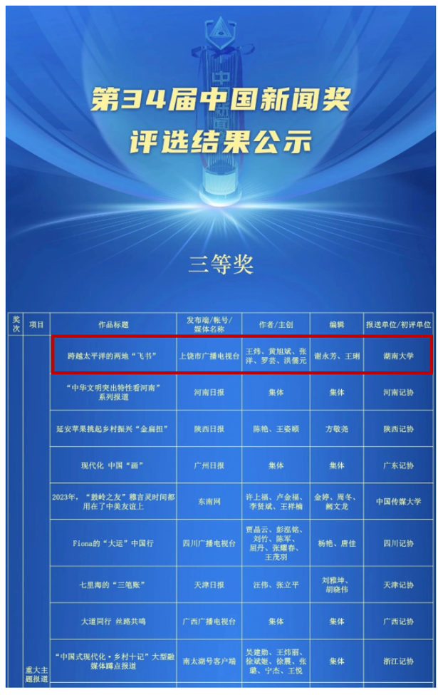 2024年10 月 29 日,中国记协对第 34 届中国新闻奖评选结果进行公示,来自全国各级各类媒体的 378 件作品入选拟获奖名单。其中,上饶市广播电视台的新闻专题片《跨越太平洋的两地 “飞书”》荣获第 34 届中国新闻奖重大主题报道三等奖。这是自2016年担任试点报送单位以来,av视频 初评报送的作品第六次荣获中国新闻奖。